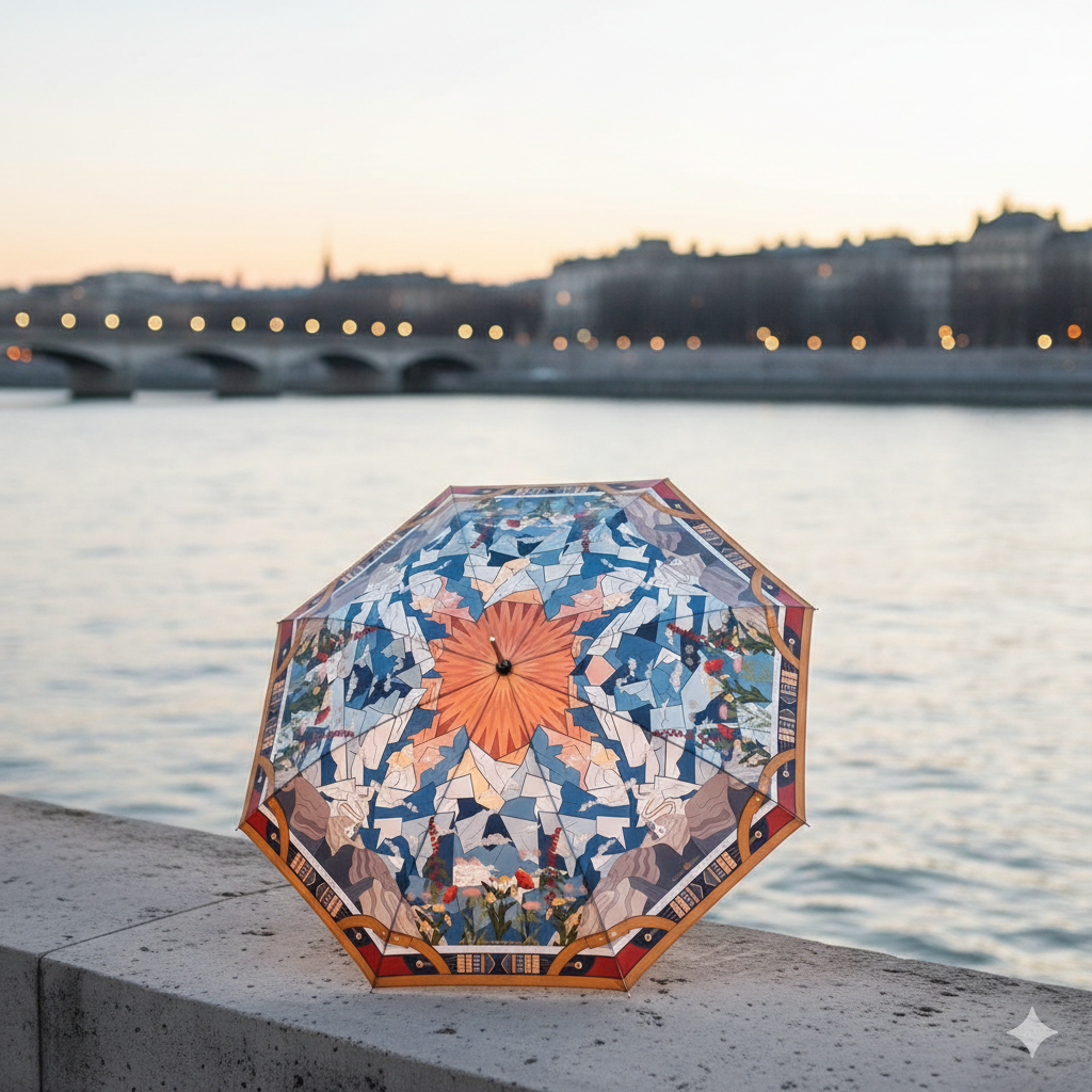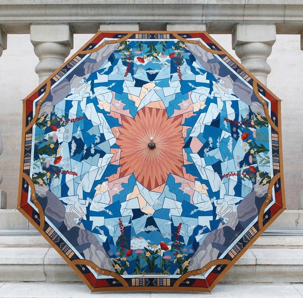 Композиция зонта позволяет ему меняться и быть разным: показать холодные горы в дымке заката или теплым и нежным , как вечерние цветы на скалах. А мотивом окантовки зонта стали детали мундира михаила Лермонтова, который он носил во время службы на Кавказе.