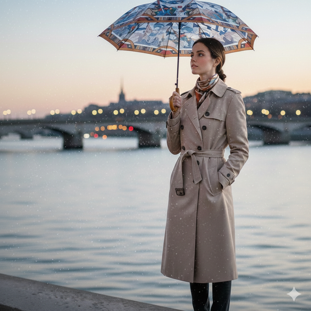 Вместе с зонтом также можно купить шелковый платок и серьги с тем же рисунком.